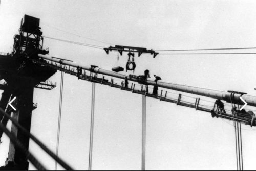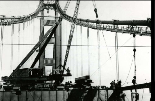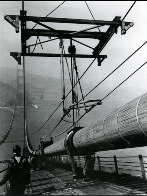 Die verzinkten Drähte jedes Hauptkabels wurden mit Hilfe eines Webstuhls verlegt, der sich hin und her bewegte, um den Kabelkörper zu bilden. Das Aufspinnen der Hauptkabel wurde in 6 Monaten und 9 Tagen abgeschlossen.