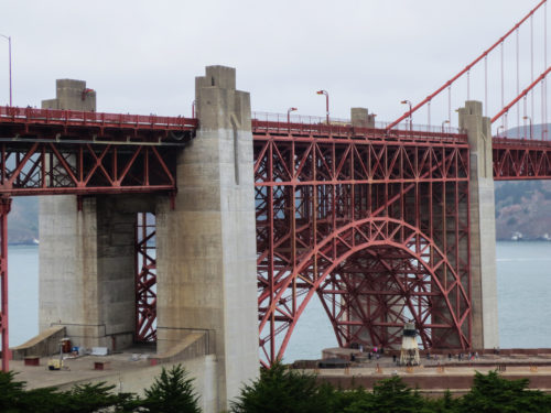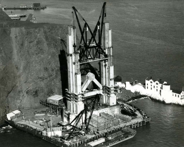 Die Verankerungen der Türme sind aus Beton, wobei die Arbeiten immer wieder durch Hochwasser und Stürme unterbrochen wurden, vor allem an der Küste von San Francisco, die vollständig dem Meer ausgesetzt ist. Zunächst musste eine Betonstützmauer errichtet werden, um einen wasserdichten Raum zu schaffen, dann musste der Felsen gesprengt werden, auf dem der Turm gegründet werden sollte, und anschließend mussten 20 m Beton unter Wasser gegossen werden, um die Basis zu bilden.