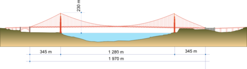 Die beiden Hauptkabel der Brücke, die zwischen zwei eleganten Türmen aufgehängt sind, wiegen jeweils 11.000 Tonnen und bestehen aus 25.000 einzelnen Kabeln, die an den Außenseiten verankert sind. Die Seile tragen nicht nur die aufgehängte Straße, sondern übertragen auch Druck auf die Türme und Brückenschwellen an beiden Enden des Bauwerks und haben eine Länge von 2332 Metern.