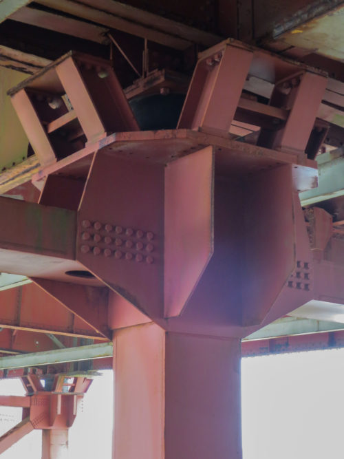 Die Brückenstege wurden in Abschnitten montiert und dann an den Türmen befestigt. Sowohl die Träger als auch die Kabel bestehen aus Stahl, und in jedem Turm wurden etwa 600.000 Nieten verwendet. Sie wurden auf 19 Grundankerplatten mit einer Dicke von 125 mm errichtet.
