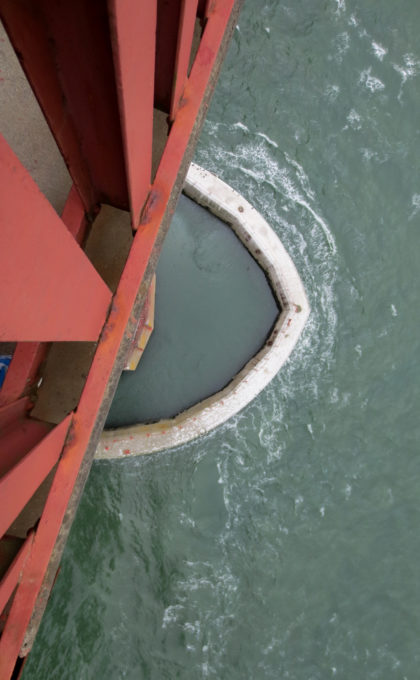 Für den Bau des Stützpfeilers für den Südturm pumpten die Bauarbeiter 35,6 Millionen Liter Wasser ab, um den zuerst gebauten Fender anzuheben.