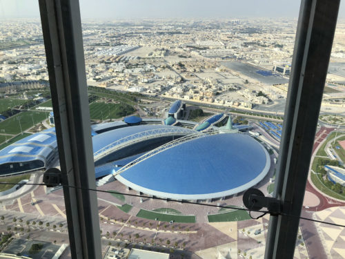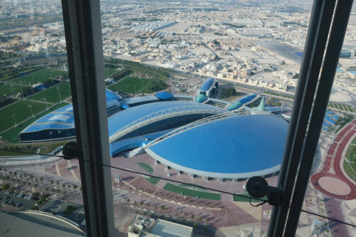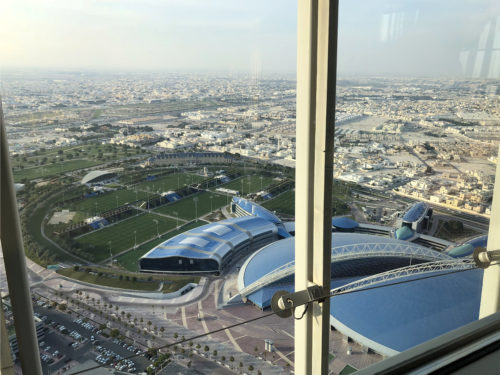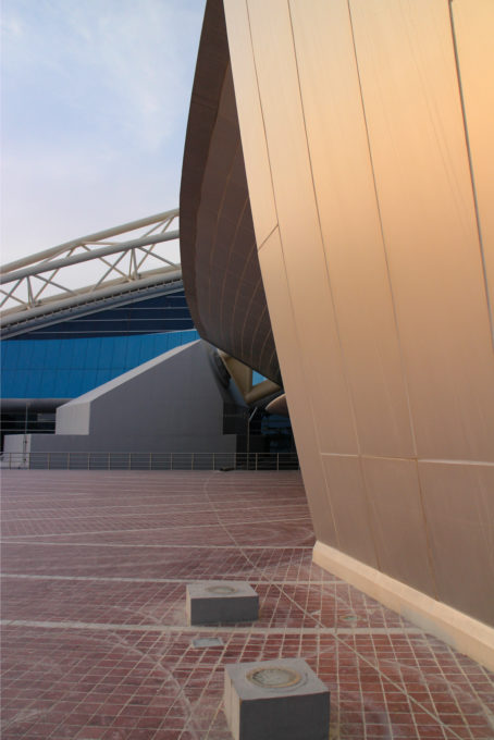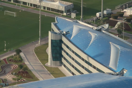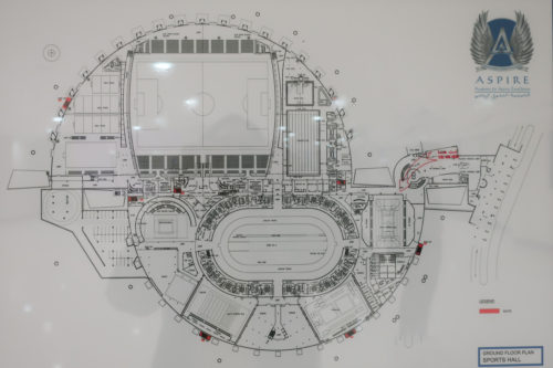 Die Aspire Dome Academy mit ihrem markanten Schrägdach ist ein imposantes, 46 Meter hohes, freistehendes Bauwerk mit fünf Ebenen und einer Gesamtfläche von 112.000 m² mit 15.000 Sitzplätzen.