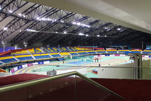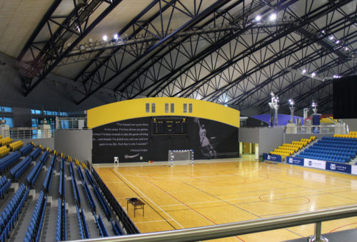In dem klimatisierten Stadion können 13 verschiedene Sportarten gleichzeitig ausgetragen werden, so dass die Studenten die Möglichkeit haben, in ihrer Hauptsportart zu trainieren, während sie gleichzeitig leichten Zugang zu erstklassigen Einrichtungen für andere Sportarten sowie zu einem Hallenfußballfeld in voller Größe haben.