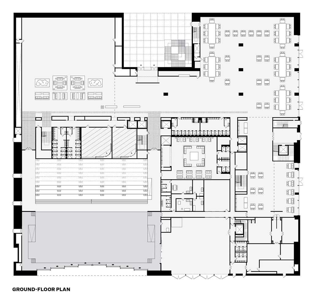 Im Erdgeschoss befinden sich neben dem großen Auditorium auch VIP-Lounges und Tagungsräume.