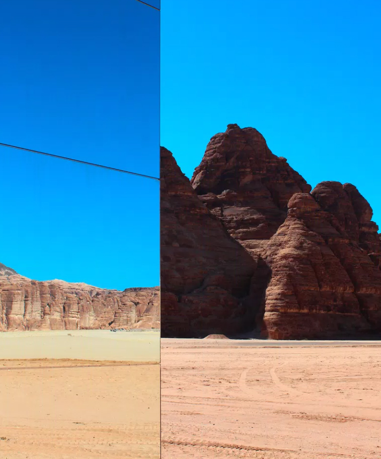 „Wir haben viel von der natürlichen Landschaft und der Architektur der Nabatäer gelernt. In Al-‚Ula werden Grabbauten und natürliche Steinhütten durch Subtraktion gebaut; menschliche Skulptur oder natürliche Kräfte, Erosion, sind also die traditionellen Gestaltungsmittel. Die reine Form des wohlproportionierten kubischen Volumens mit kleinen Subtraktionen war für uns die offensichtlichste Form. Das reflektierte Volumen steht im Dialog und „flirtet“ mit dramatischen Felsen und dem Himmel. Aber es ist immer noch eine Aussage von „Kunst“. Die architektonischen Funktionen, der Konzertsaal, der Kunstpavillon und die Restaurants wurden eher geheimnisvoll als offensichtlich…“, sagt Florian Boje von Giò Forma.
