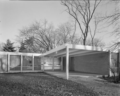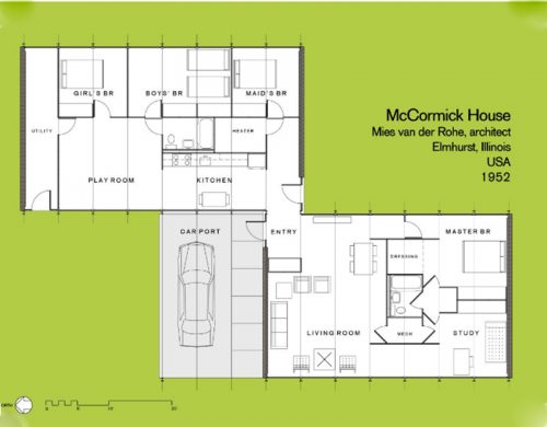 Das McCormick House, ein Prototyp eines Fertighauses, das für den Stadtteil West Chicago vorgeschlagen wurde, besteht aus zwei versetzten, aneinandergefügten Körpern, die den Zweck haben, getrennte Flügel zu bilden, einen für die Eltern und einen für die Kinder.