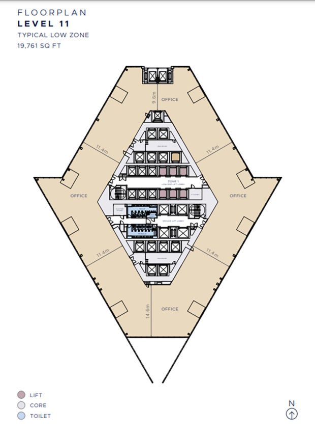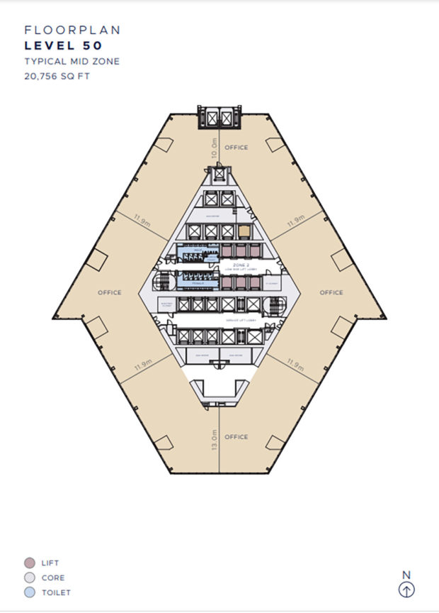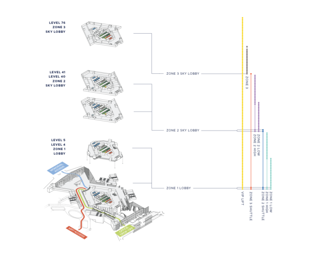 Die 50.000 Quadratmeter Bürofläche verteilen sich auf die Etagen 8 bis 98, dazwischen liegen die Dienstleistungsetagen auf den Ebenen 42 und 77.