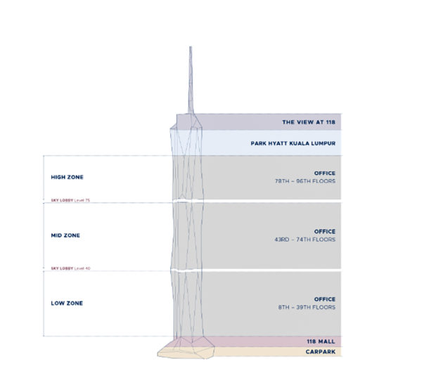 Der 118-stöckige Turm ist in Büroflächen, ein Hotel, ein Dachrestaurant und eine Aussichtsplattform unterteilt.