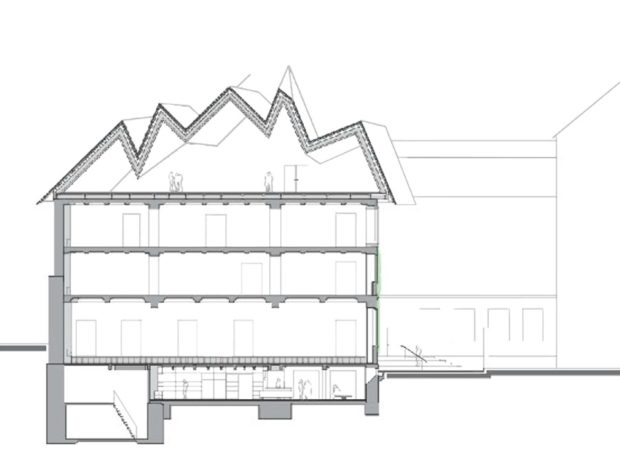 Das Hauptgebäude mit dem Treppenhaus und der Halle in der Höhe des Gebäudes wurde um ein vorspringendes, stützenfreies Obergeschoss erweitert. Das neue, 650 m2 große, selbsttragende Dachgeschoss, eine Konstruktion, die auf dem bestehenden Fußboden errichtet wurde, ruht auf den Außenwänden, die als Auflagefläche dienen.