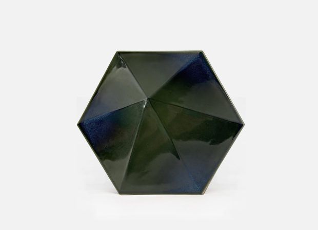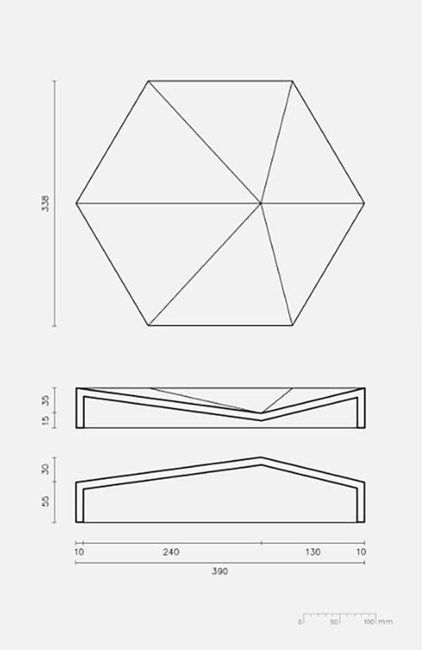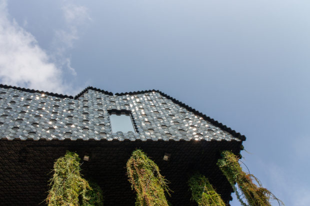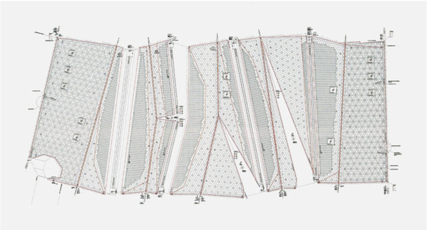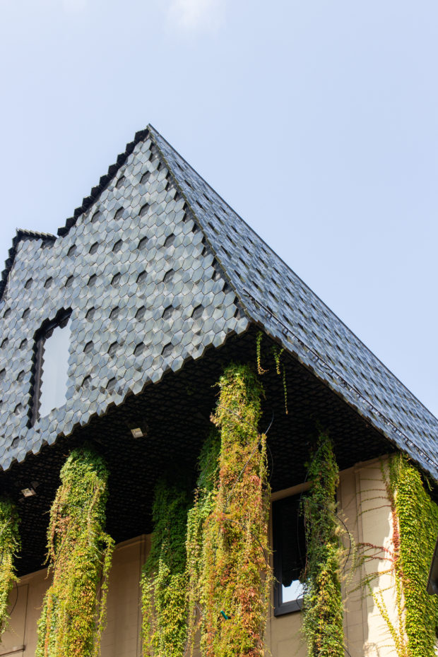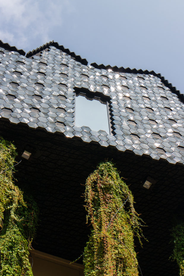 Das gefaltete Dach in Form eines Gebirges ist mit 10.000 glasierten, dreidimensionalen sechseckigen Keramikfliesen bedeckt, die speziell für dieses Projekt entwickelt wurden. Aufgrund ihrer ungewöhnlichen Form und je nach Lichteinfall, Tageszeit und Betrachtungswinkel erzeugen sie ein ständig wechselndes Erscheinungsbild, bei dem sich ihre grüne Farbe mit wechselnden Helligkeits- und Farbtoneffekten abwechselt.