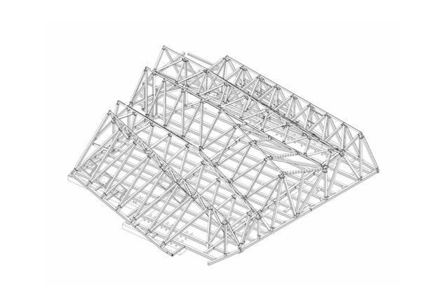 Um diese besondere Ausstellungshalle unterzubringen, wurde das ursprüngliche Giebeldach durch eine neue Konstruktion ersetzt. Da die vorhandenen Außen- und Innenwände keine zusätzlichen Lasten tragen konnten, wurde ein selbsttragender Holzrahmen errichtet, der sich über das gesamte Gebäude erstreckt.