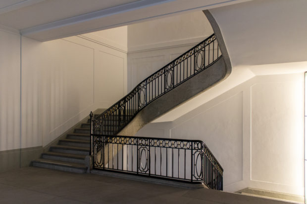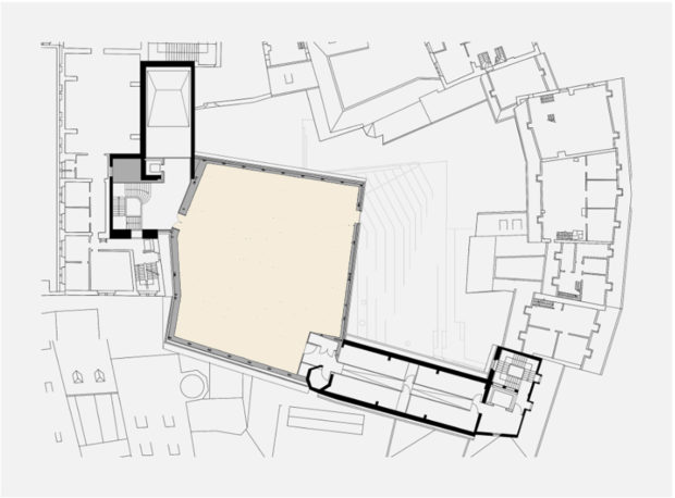 Um die Eingangshalle zu schaffen, wurde das ehemalige Untergeschoss zum Hof hin geöffnet, der wiederum in Form eines Amphitheaters abgestuft und für museale Zwecke erweitert wurde. Eine versenkte Glaseinfassung schließt die gesamte Fassade ab und schafft eine visuelle Beziehung zwischen dem Innen- und dem Außenbereich.