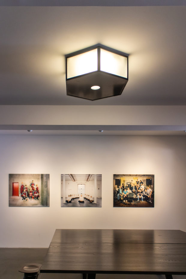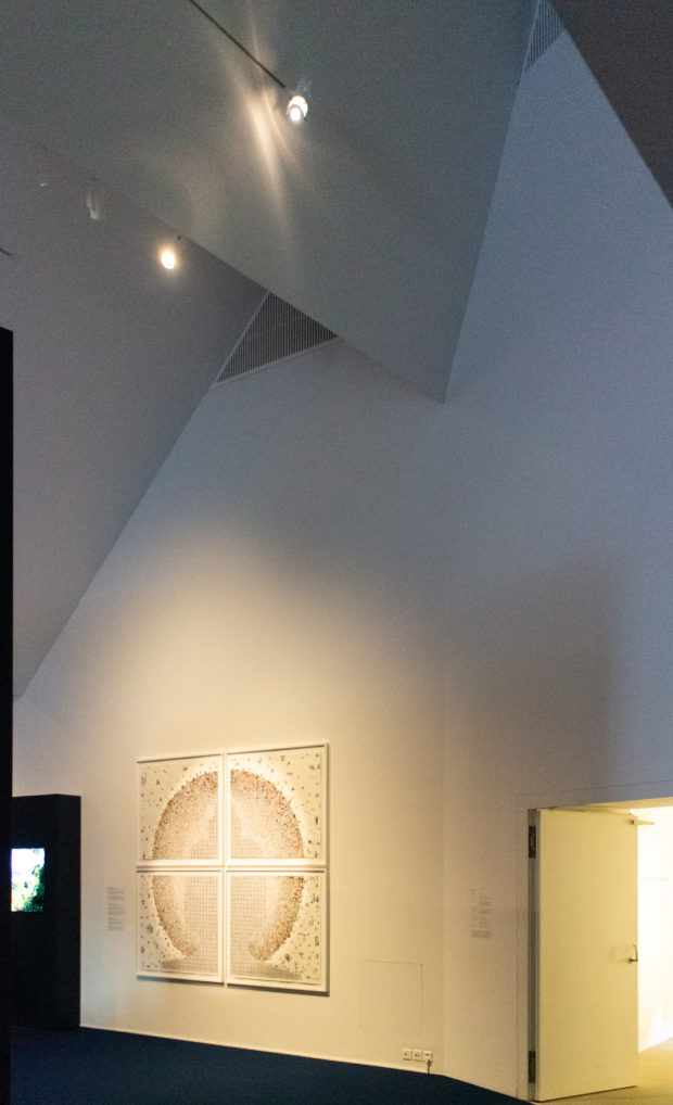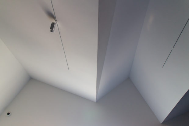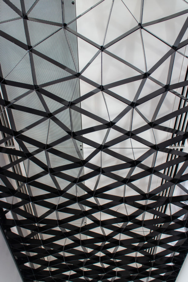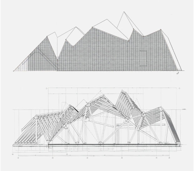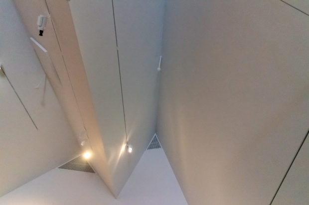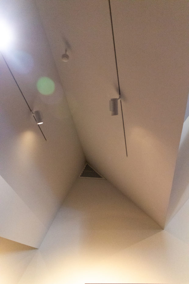 Der Stahlrahmen des gefalteten Daches ermöglicht eine stützenfreie Galerie darunter, 650 m2 ausdrucksstarker Raum, der einen auffälligen Kontrast zu den ruhigen, rechtwinkligen Galerien der unteren Stockwerke bildet. Die Geometrie des Obergeschosses ähnelt einem sägezahnförmigen Dach mit unregelmäßigen Graten, in Wirklichkeit handelt es sich jedoch um ein leichtes, stützenfreies Raumgerüst. Der ausdrucksstarke Raum bietet einen auffälligen Kontrast zu den ruhigen rechteckigen Galerien in den unteren Stockwerken.