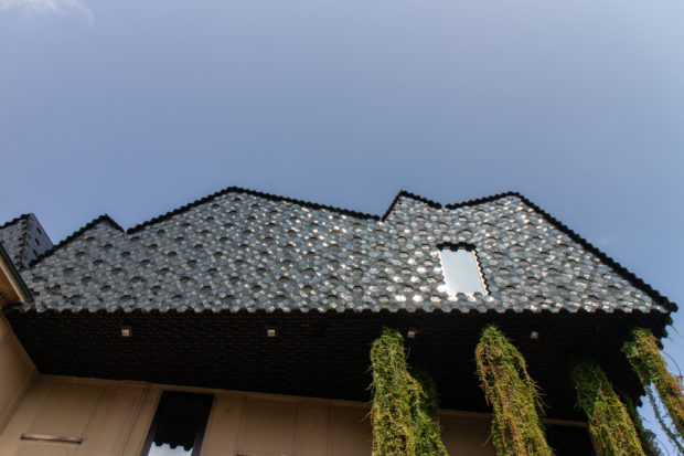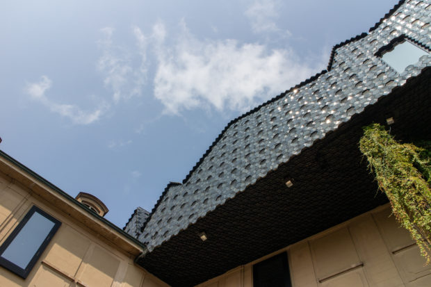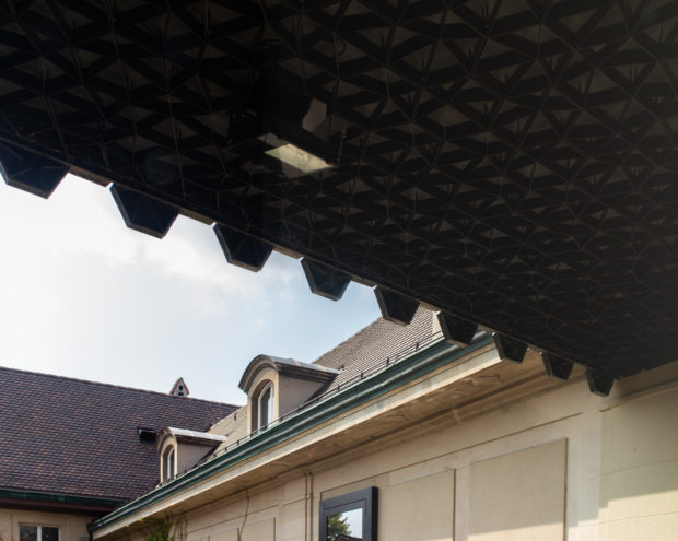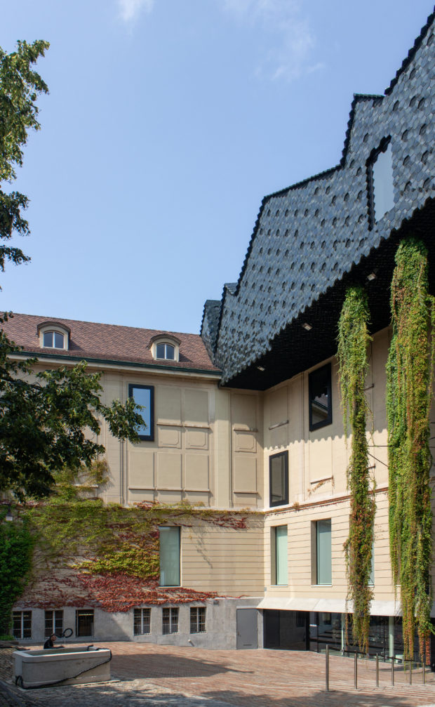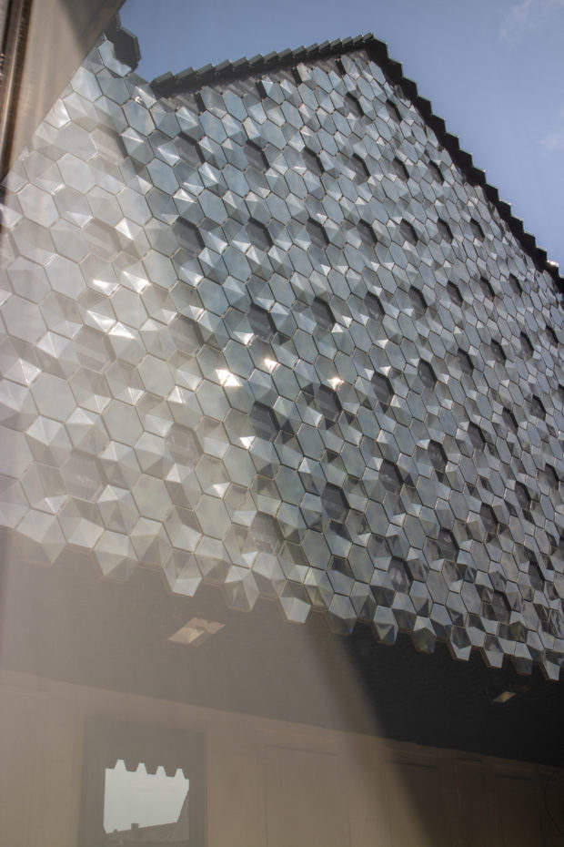 Das aus unregelmäßigen Falten bestehende Dach, das mit schwarz-grünen Keramikziegeln bedeckt ist, steht im Einklang mit der mittelalterlichen Landschaft, in die es eingebettet ist, und ist gleichzeitig ein deutliches Zeichen der Erneuerung im Herzen des Viertels. Die sechseckigen, zum Teil dreidimensionalen Ziegel brechen das Licht auch bei bewölktem Himmel und erzeugen einen Effekt, der den fein strukturierten Ziegeln auf den Dächern der Altstadt sehr ähnlich ist.