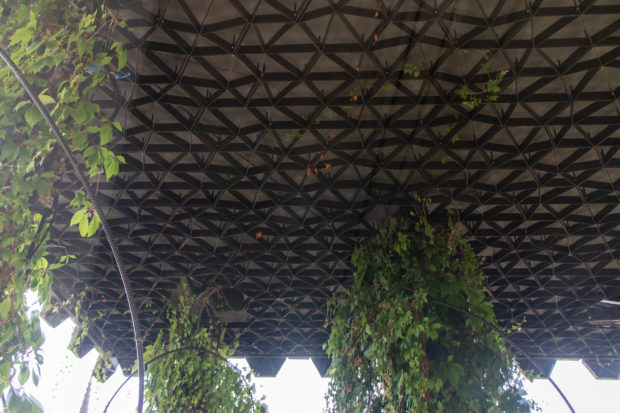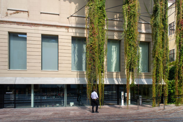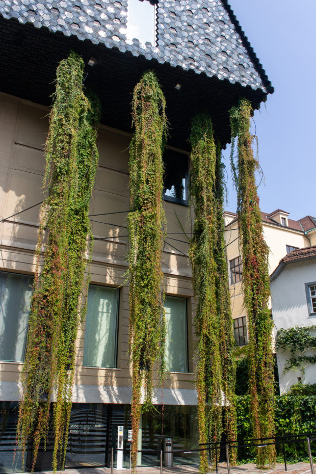 Der schwere, introvertierte Eindruck des Gebäudes, der seinen Inhalt zunächst verbirgt, wird durch die Fassaden, von denen viele Fenster geschlossen sind, und durch die spiralförmige Konstruktion zur Abstützung der überhängenden Vegetation, die unter der Traufe des darüber liegenden Kragdachs angebracht ist, verstärkt. Dies wird jedoch durch die Fundamente ausgeglichen, die über die gesamte Länge des Gebäudes offen sind und Besucher willkommen heißen. Diese architektonischen Eingriffe gliedern zusammen mit der Vegetation das lange, kantige und einheitliche Vischer-Gebäude von 1917 in verschiedene Abschnitte.
