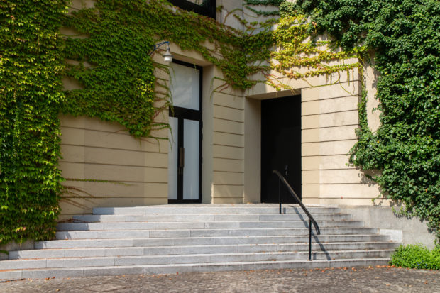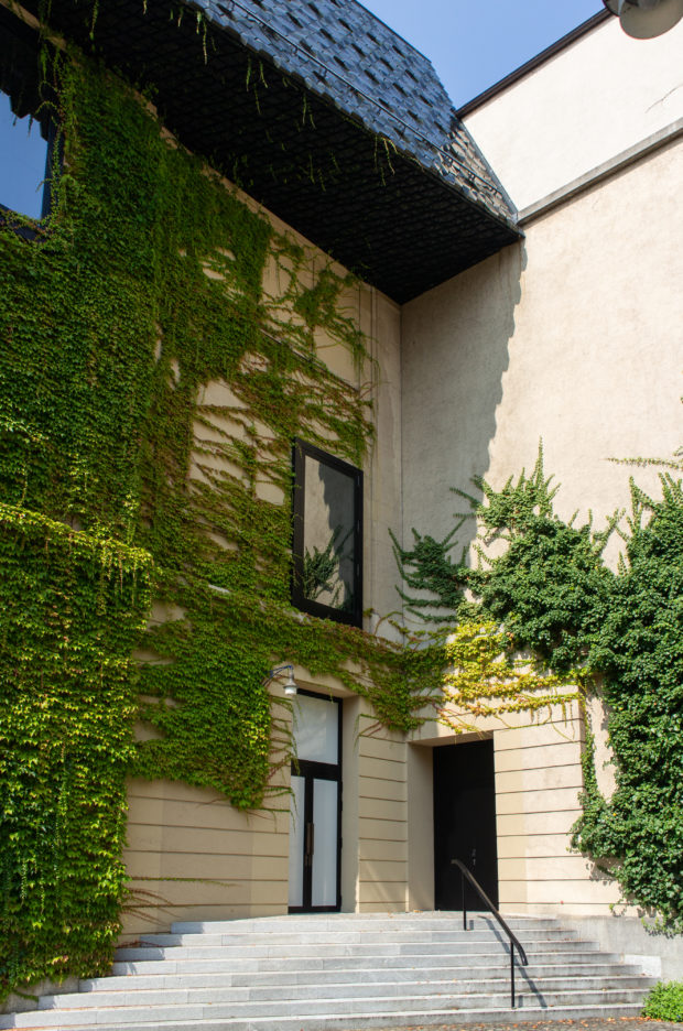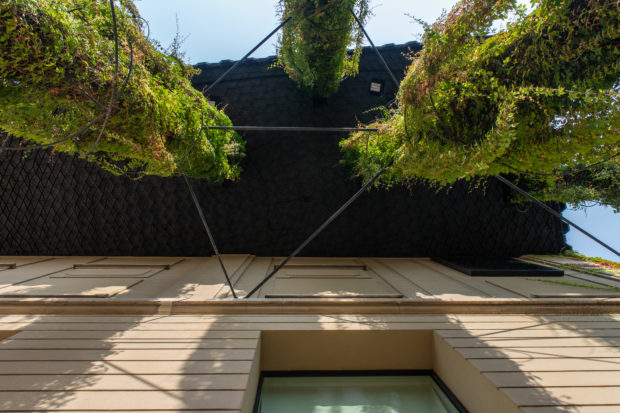 Die Eingangsfassade ist mit einem hängenden Garten geschmückt, der den großen Überhang unterbricht. Der Rest der Fassaden ist mit Virginia-Kletterpflanzen bewachsen.