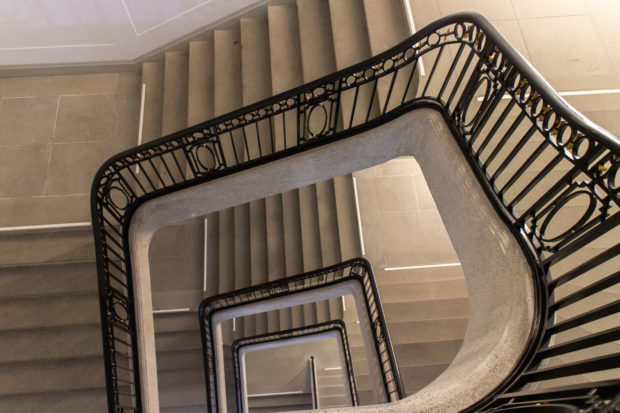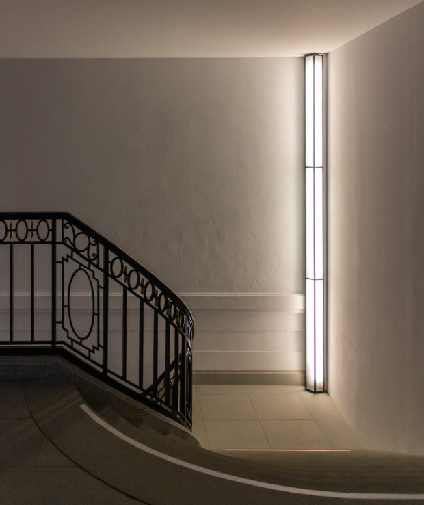 Die Öffnung der neuen Fassade auf der Eingangsebene wird durch einen Stützbalken ermöglicht, dessen Last von den vorhandenen Stützen und den neuen Verbundstützen abgetragen wird.
