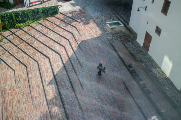 Der Hof mit der charakteristischen „Patchwork“-Anordnung der hinteren Teile der mittelalterlichen Gebäude wurde zu einer Erweiterung des Münsterplatzes, dem Hauptplatz der Stadt, und zu einem sozialen Treffpunkt für alle Arten von Museumsaktivitäten und Festen. Ein Teil davon wurde abgesenkt und eine breite, leicht abfallende Treppe führt zum Eingang des Museums. Hängepflanzen und Weinreben verleihen ihm ein unverwechselbares Ambiente und im Zusammenspiel mit dem Dach eine neue Identität.