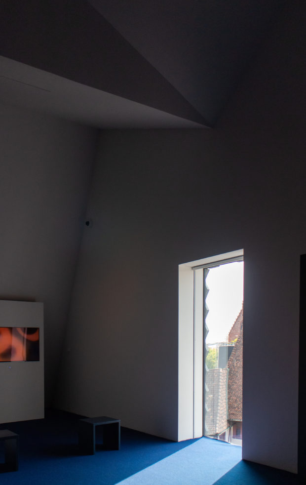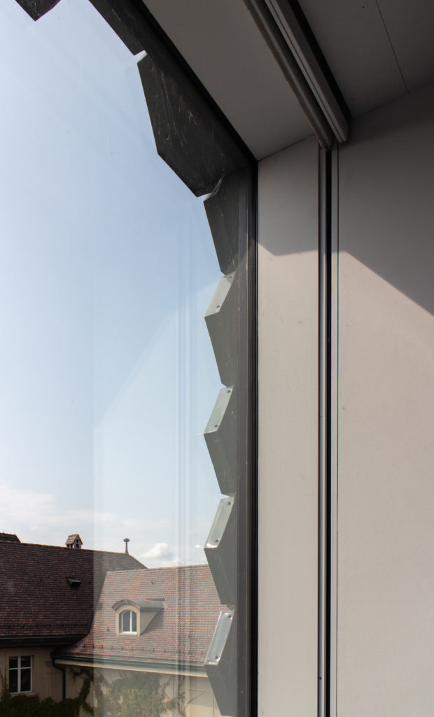 Trotz der ungleichmäßigen Faltung des Daches ist es so gegliedert, dass es sich an den Maßstab der Landschaft der benachbarten historischen Gebäude anlehnt.