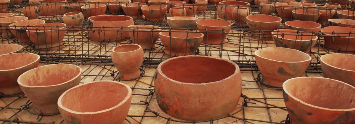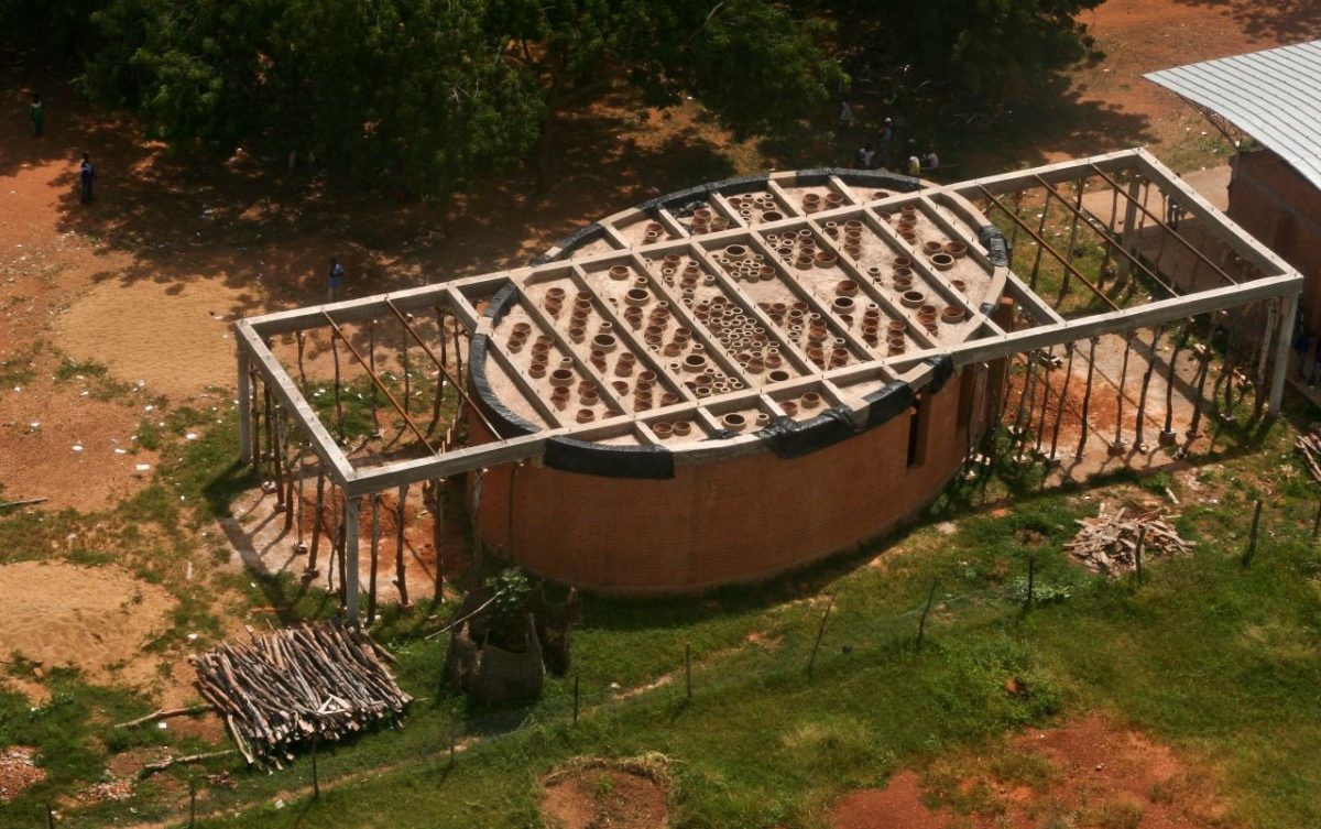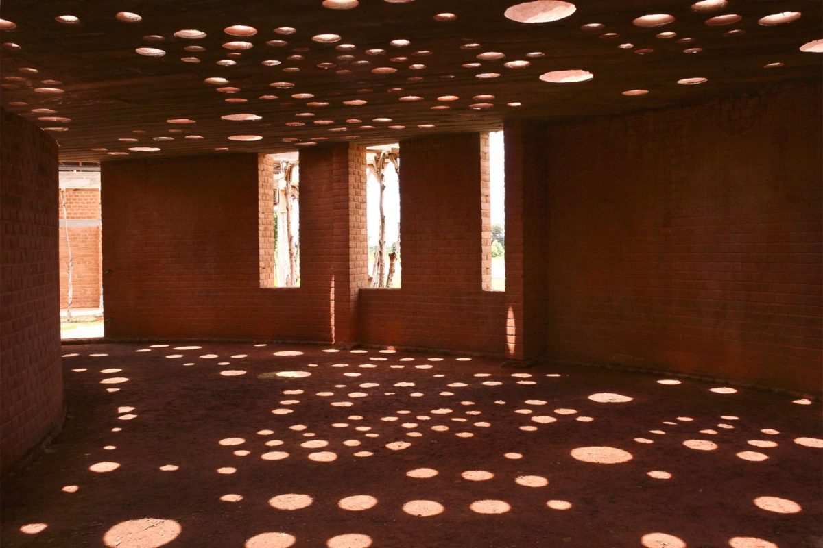 Für das Dach der Schulbibliothek wurde ein weithin anerkanntes Handwerk verwendet: lokal hergestellte Tontöpfe. Die traditionell von den Frauen des Dorfes in Handarbeit hergestellten Tontöpfe wurden in zwei Hälften gesägt und dann im Dach versenkt. Diese kreisförmigen Öffnungen bilden ein spielerisches Muster und bringen natürliches Licht und passive Belüftung in die Bibliothek.