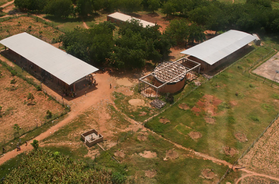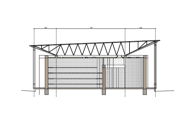 Für den Bau wurden die gleichen Materialien wie bei den vorherigen Gebäuden verwendet: für die Wände verdichtete Blöcke aus lokalem Lehm, Betonplatten und ein Stahlgerüst, das die Wellblechplatten trägt.