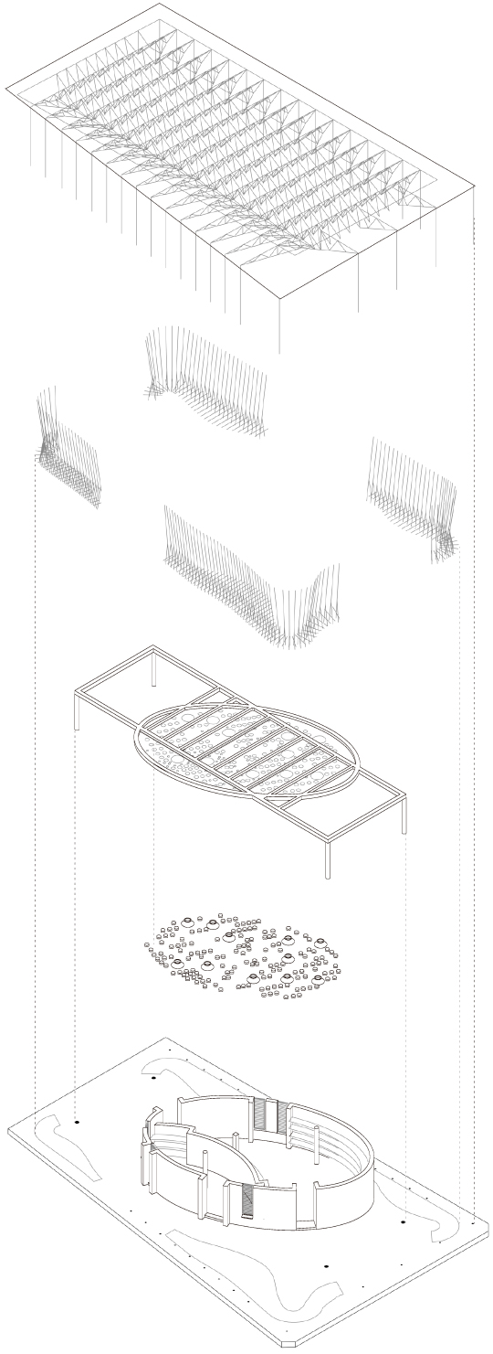Die geschnittenen Töpfe sind in die Betonplatte eingelassen und durch ein auskragendes Dach aus Wellblech geschützt, das über das Bibliotheksgebäude hinausragt und auf zahlreichen schlanken Säulen aus einheimischem Eukalyptusholz ruht, einem Holz, das in dieser Gegend nie als geeignetes Baumaterial in Betracht gezogen wurde.