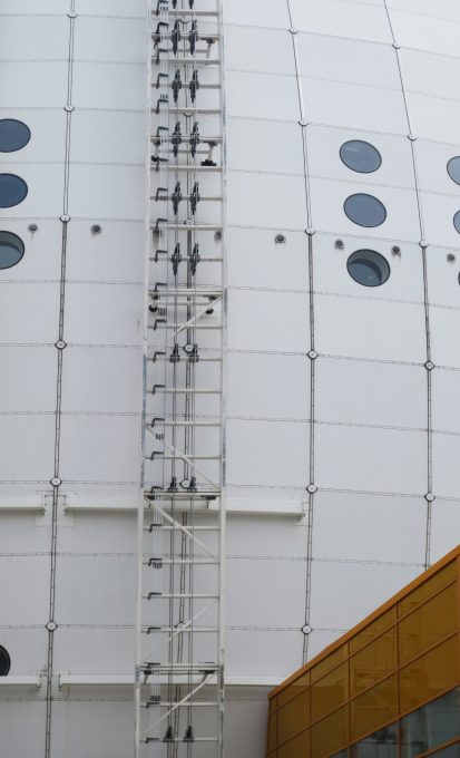 Durch die großen Oberflächen des Ballons kann sich an der Außenseite des Ballons, insbesondere auf dem Dach, viel Schnee ansammeln. Die maximale Fallhöhe von Schneemassen beträgt 60 Meter. Daher sind alle unteren Decken in der Falllinie dieser Massen so dimensioniert, dass sie die gelegentlich seitlich herabfallenden Massen tragen. Auf der Ostseite gibt es kein Gebäude, und es ist die einzige Stelle, an der die volle Krümmung der Kugel bis zum Boden zu sehen ist. Dort wurde das Sicherheitsproblem durch den Bau eines Teiches zwischen den angrenzenden Gebäudeteilen gelöst.