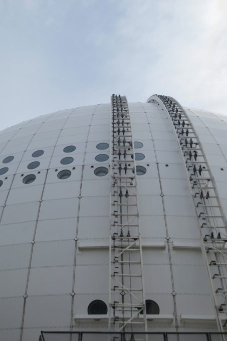 Die kugelförmige Struktur besteht aus Stahlträgern, die mit einer feuerfesten Farbe beschichtet wurden, bevor die weiße Aluminiumfassade angebracht wurde.