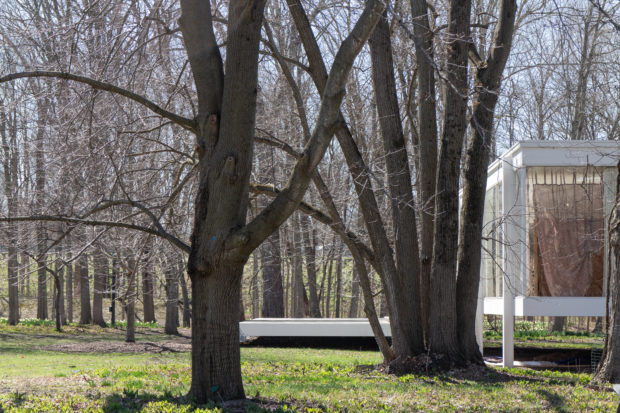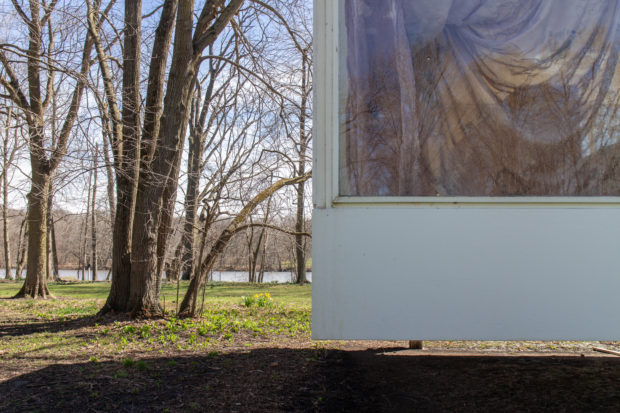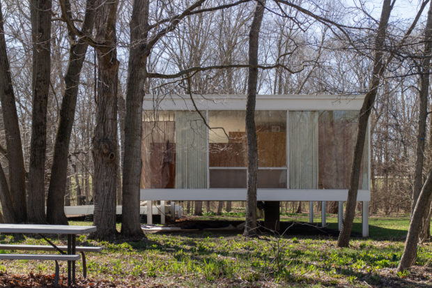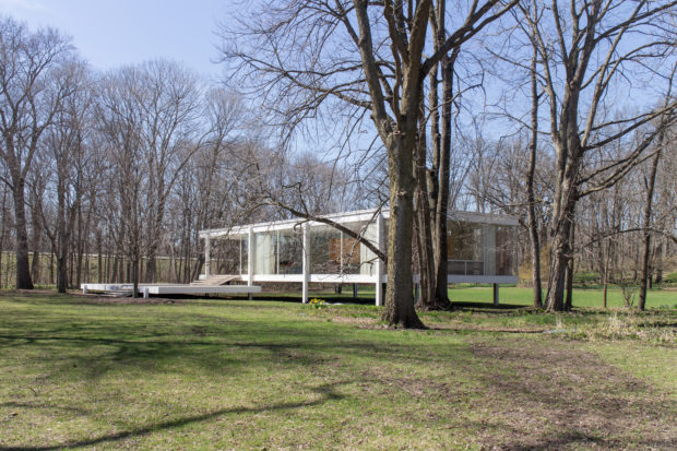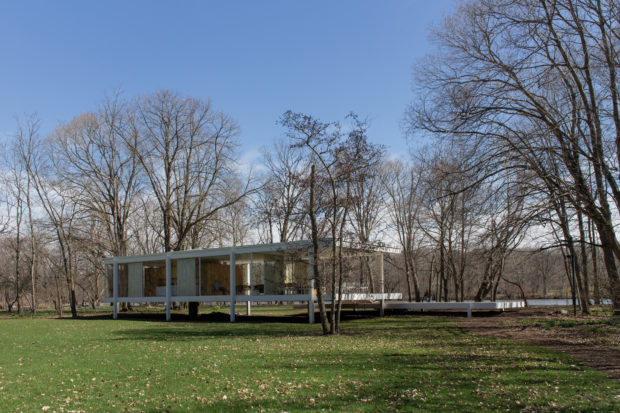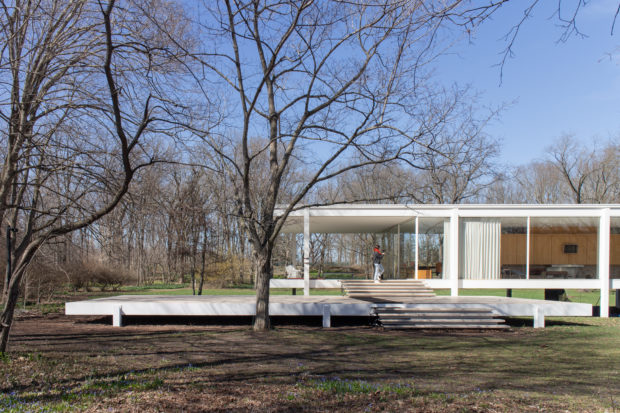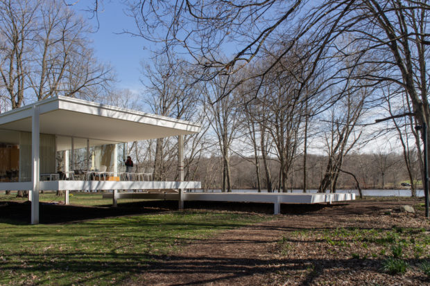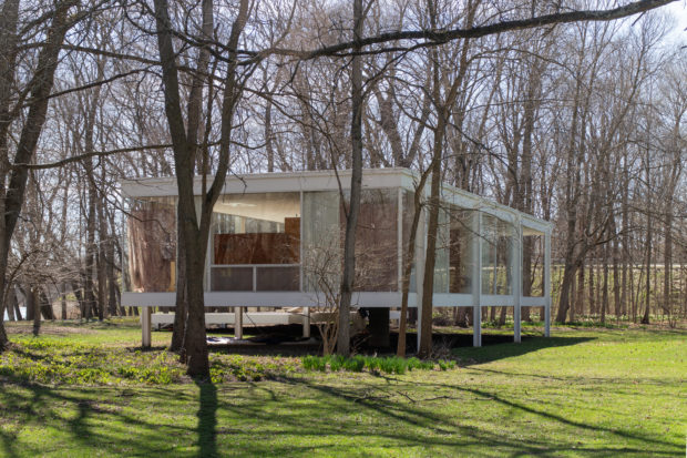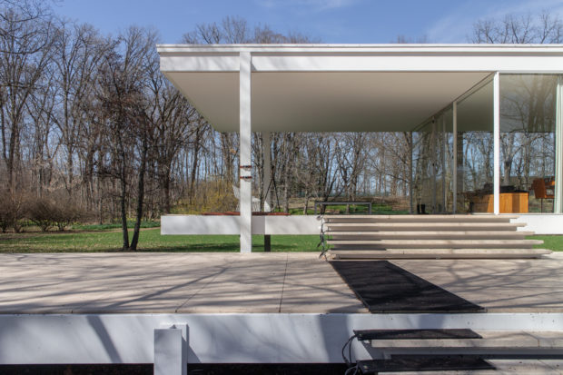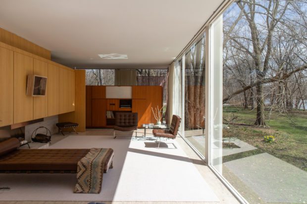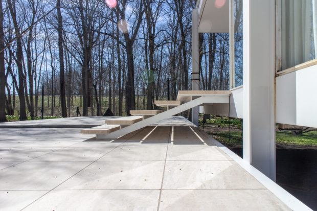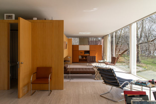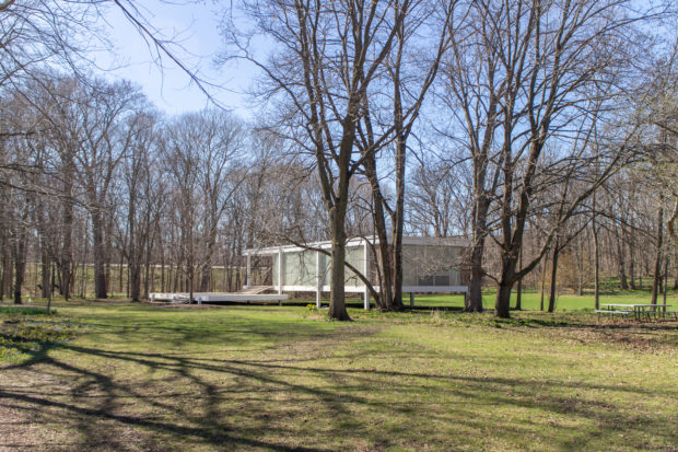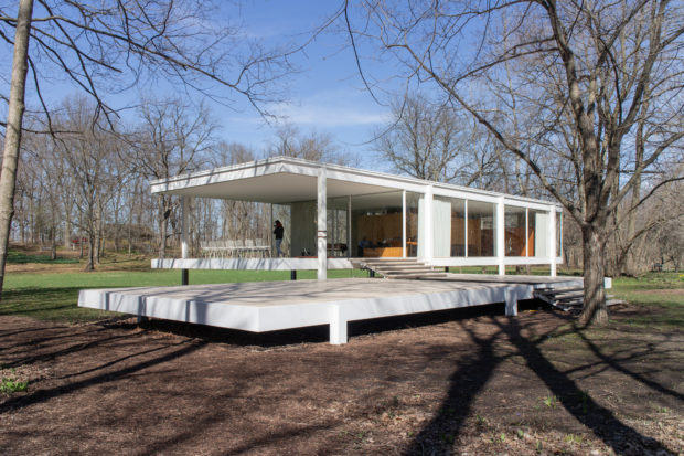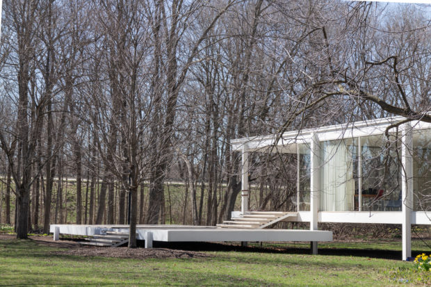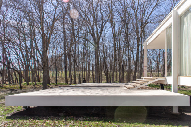 Das Farnsworth House, eine Ikone der Architektur der Moderne, liegt in einer natürlichen Umgebung, ganz in der Nähe eines Flusses, mit einer Seite zu einem Wald, der es vom fließenden Wasser trennt, und der anderen Seite zu einer kleinen Wiese.