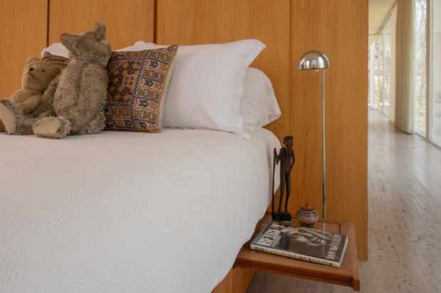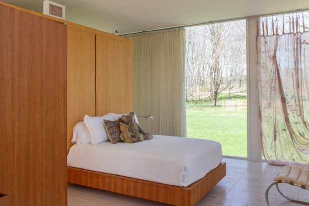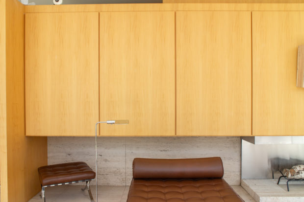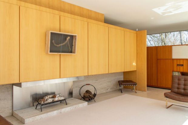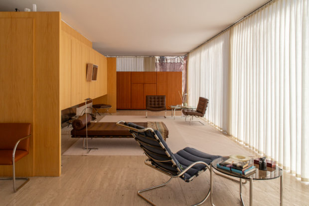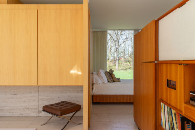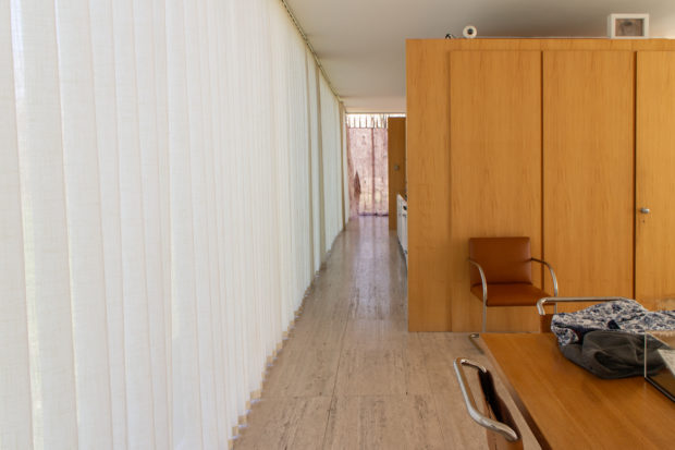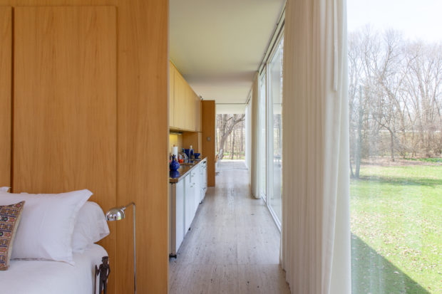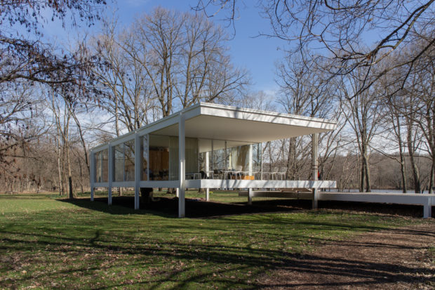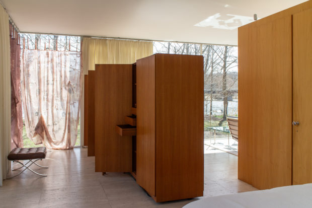 Dieses Haus, das kein Haus zu sein scheint, vielleicht wegen seines Wunsches nach Transparenz, ist dennoch ein architektonischer Diskurs, eine Meditation über „weniger ist mehr“ oder über „fast nichts“, um es mit den Worten von Mies zu sagen. Ein sprachlicher und räumlicher Reduktionismus, der wie eine palladianische Villa komponiert ist, obwohl sie nicht auf einem Podest, sondern in der Leere steht, obwohl sie keine Säulen, sondern weiße Balken verwendet, die wie ein Paravent wirken, der den Ort der Transparenz zu umhüllen scheint, d.h. den Raum des Hauses, den Raum der Leere. Eine Lücke, die sein Mitarbeiter und Bewunderer Philip Johnson mit Intimität füllt, indem er versucht, den Meister in seinem eigenen Haus, dem Glass House in New Canaan (1949), nachzuahmen.