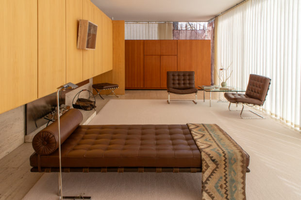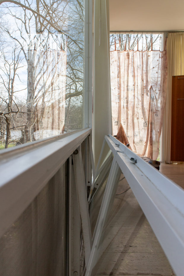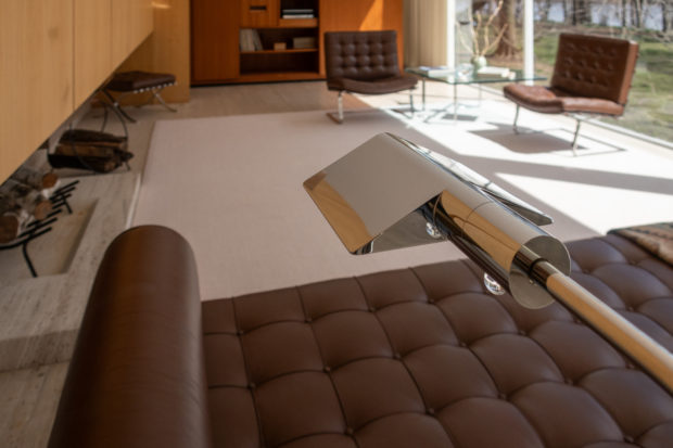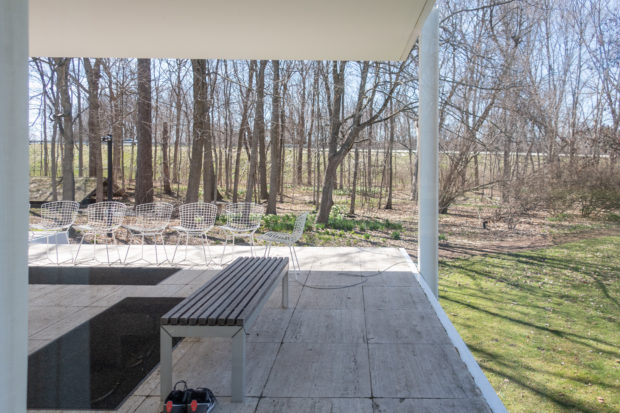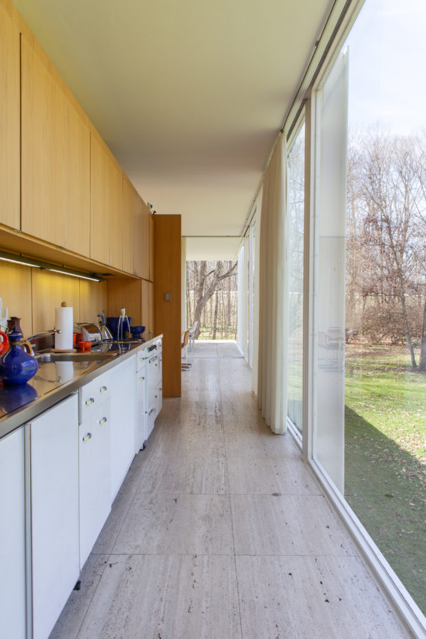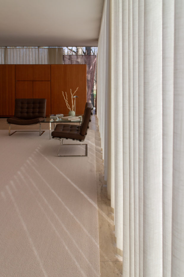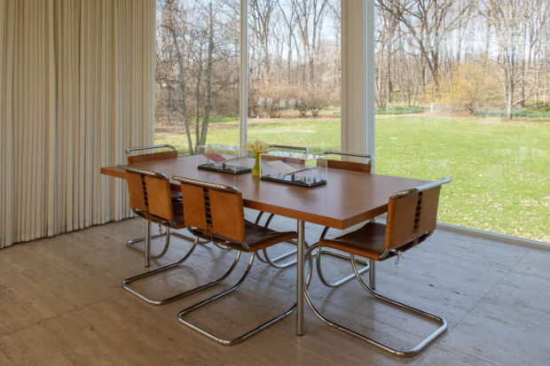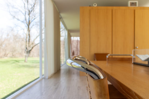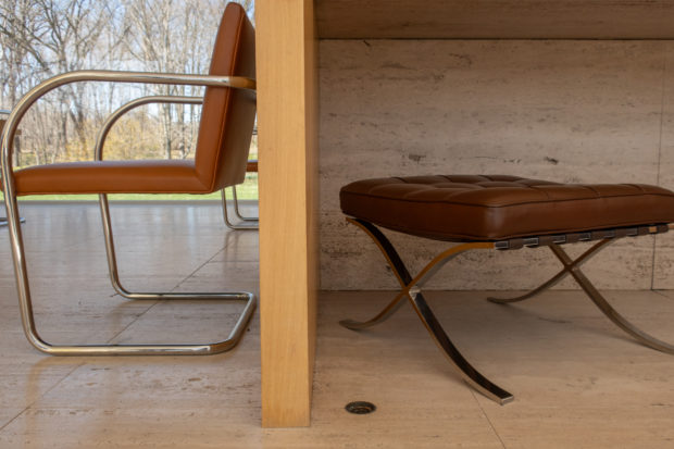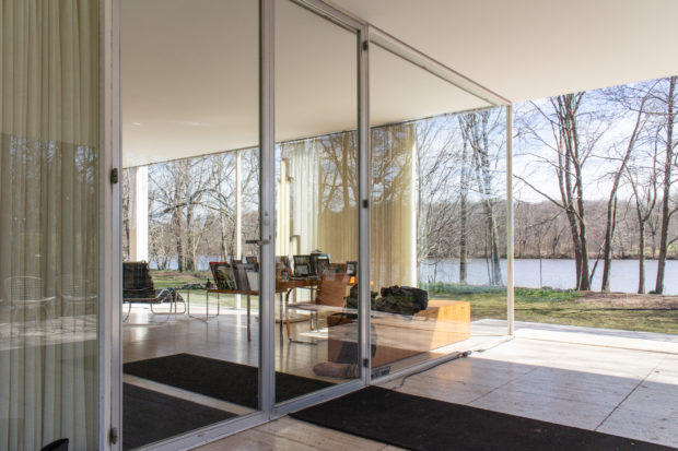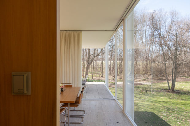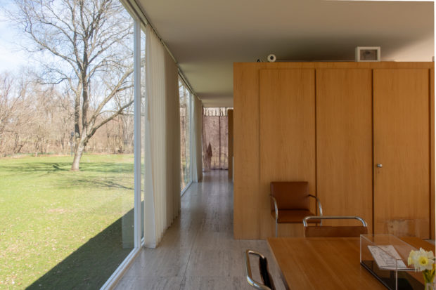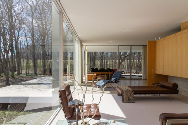 Das Haus besteht aus einer nur von Glas umschlossenen Metallstruktur, die dem Konzept eines Belvedere entspricht und so der Schönheit des das Haus umgebenden Raums Tribut zollt. Die Transparenz ermöglicht die volle Wahrnehmung der Landschaft von innen, wirkt aber auch in die entgegengesetzte Richtung und bezieht den Innenraum des Hauses auf radikale Weise in die Enklave ein. Mies handelte in vollem Bewusstsein dieser Verantwortung und prüfte jedes Element sorgfältig auf seine Auswirkungen auf den neuen Standort. Der Architekt wählt bewusst die Bedingungen des Ortes, den er annimmt, und wie er mit ihnen umgeht.