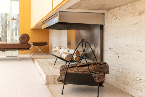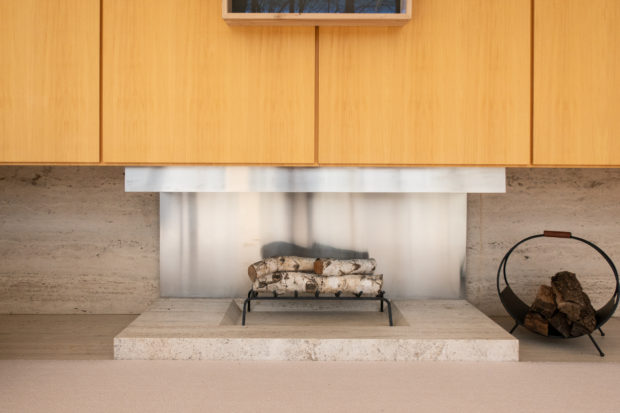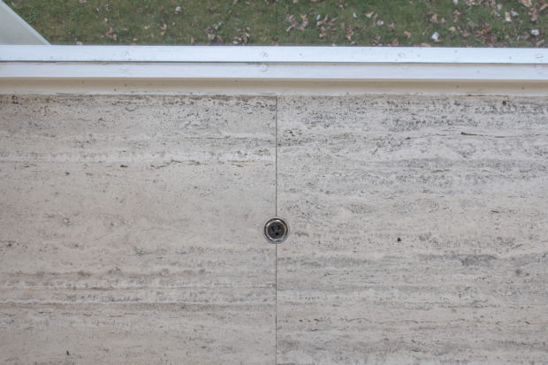 Der Boden aus Travertinmarmor wurde so verlegt, dass die Platten weder unterbrochen noch perforiert sind und somit ein fließender Übergang zwischen Innen- und Außenbereich entsteht.