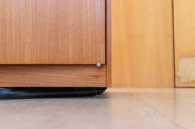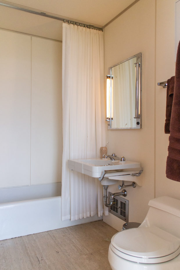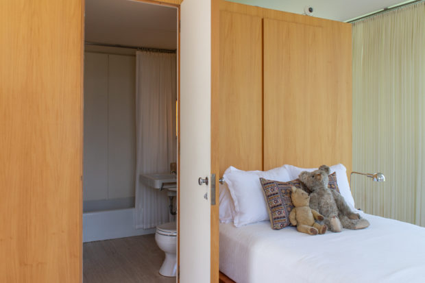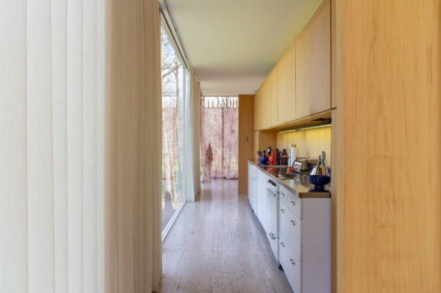 Ein zweites Merkmal ist, dass das Haus keine vor Ort hergestellten Innenwände hat. In der Mitte des Raumes gibt es nur einen hölzernen Kern, in dem zwei durch einen Schrank getrennte Badezimmer untergebracht sind und neben dem sich auch eine Küche befindet, eine so genannte „amerikanische“ Küche.