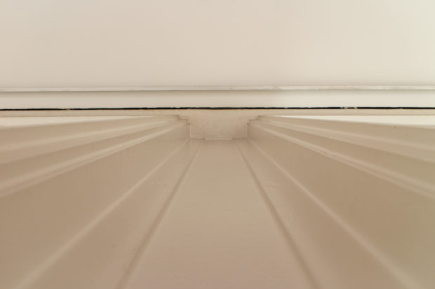 Dieser asymmetrische Kern, der bis auf den mittleren Teil nicht bis zum Dach reicht, kontrastiert mit der Fassade aus Stahl und Glas, die hauptsächlich aus Sperrholz besteht. Der Kern ist der einzige Ort, an dem die Elemente die strengen Decken- und Bodenebenen durchdringen. Die Entwässerung und die Abflüsse verlaufen durch den Fußboden, und ein vertikaler Schacht mit den Entlüftungsöffnungen des Badezimmers und dem Schornstein führt zum Dach und nach außen, so dass auch alle Versorgungsleitungen, Strom und Wasser angeschlossen werden können. Die Versorgungsleitungen werden in den unzugänglichsten und unauffälligsten Bereichen der Platten verborgen, so dass sie sowohl von innen als auch von außen fast unsichtbar sind.