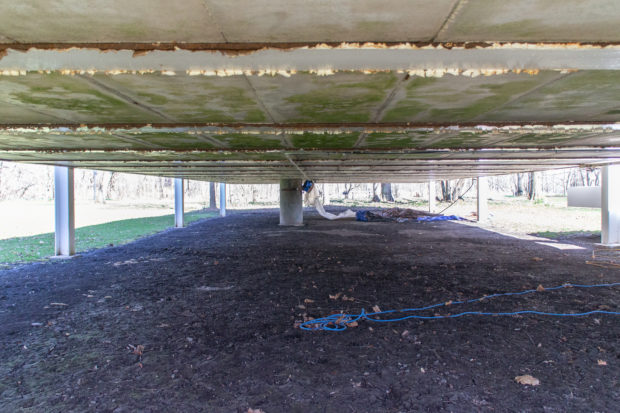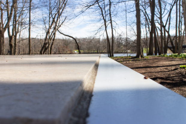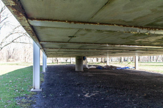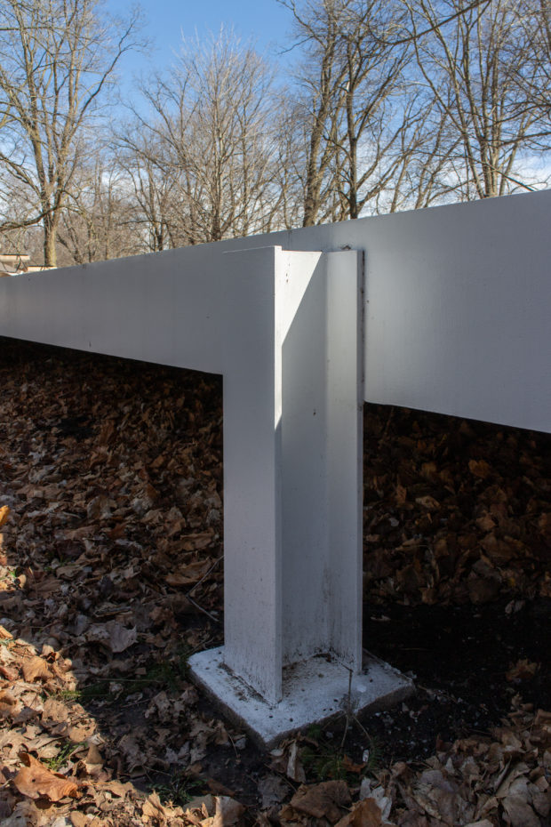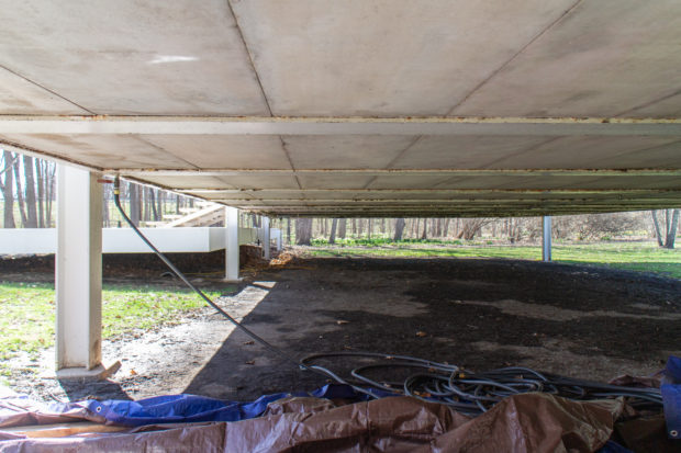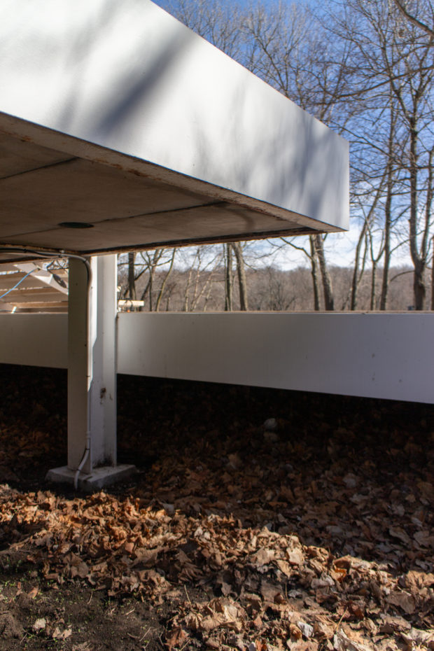 Das Volumen des Farnsworth-Hauses liegt parallel zum Flussbett, aber wenn das Wasser überläuft, überschwemmt es die Ufer und verwischt jeden Bezug zu den Flussufern. Mies schlägt eine Struktur auf Pfeilern vor, die eine geringere Kontaktfläche zum Boden bietet und den Wasserfluss nicht behindert. Auf diese Weise werden die horizontalen Ebenen radikal vom ursprünglichen Terrain getrennt.