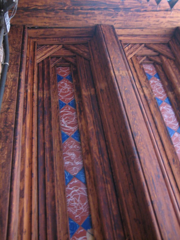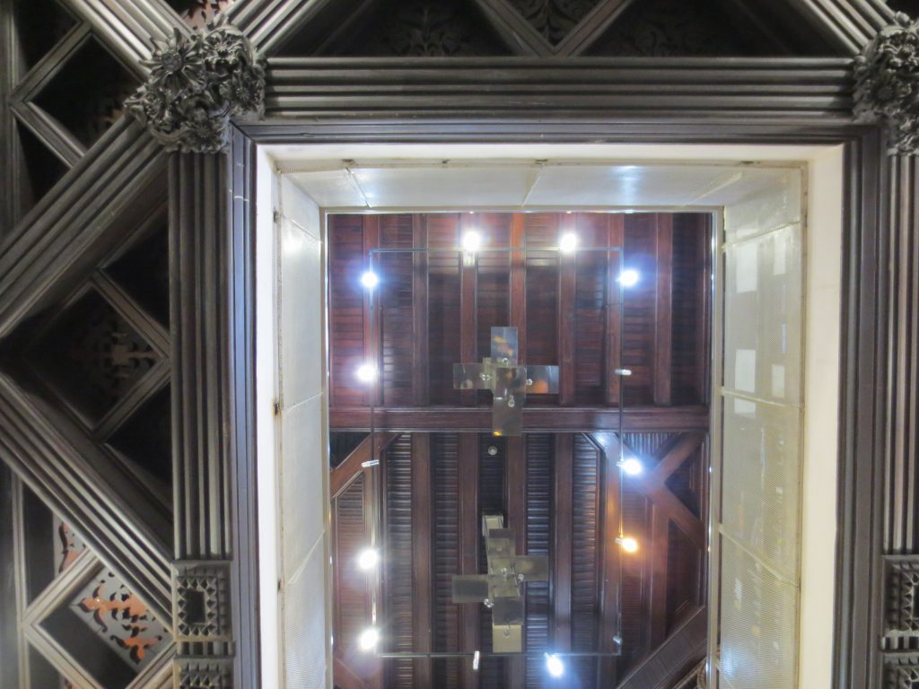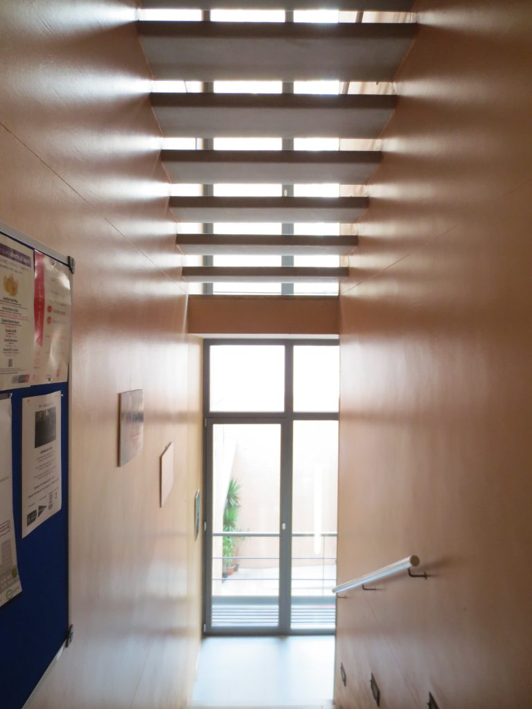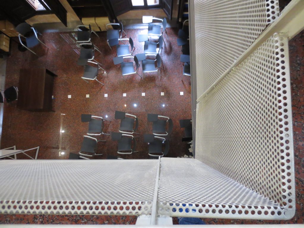 Die Holztreppe zeigt ein Spiel von Beziehungen und Transparenzen, das durch die farbigen Reflexionen, die von den hohen Glasscheiben ausgehen, noch verstärkt wird. Entlang des Weges kann der Besucher verschiedene Formen und Sgraffiti an den Wänden und auf den Holzelementen erkennen. Außerdem schmiedeeiserne Ornamente an den Geländern und Gittern.