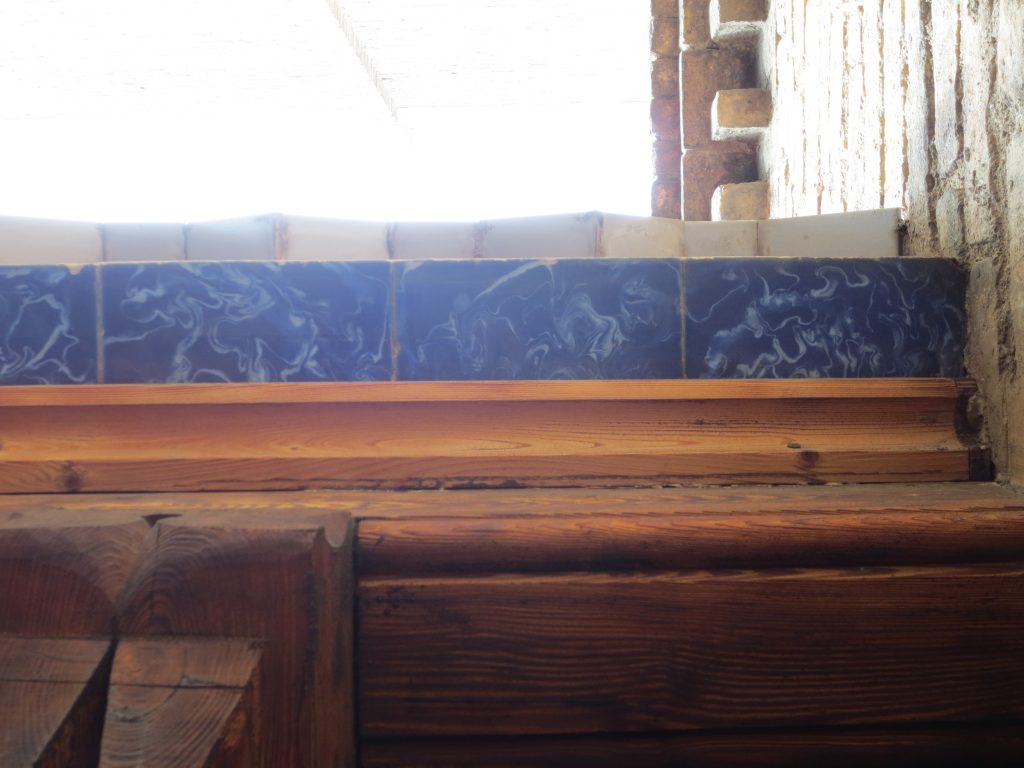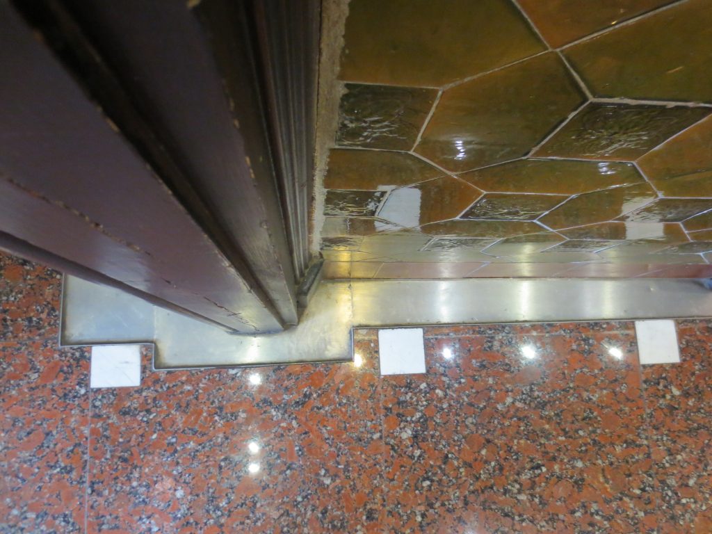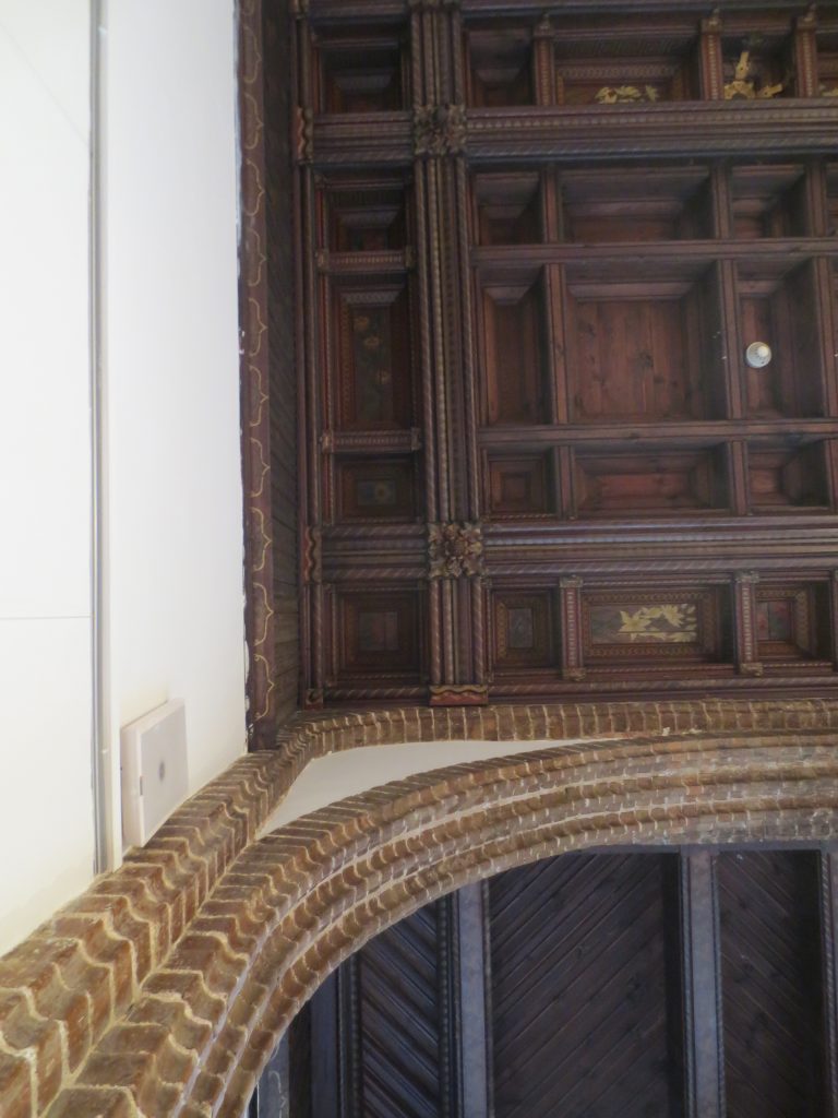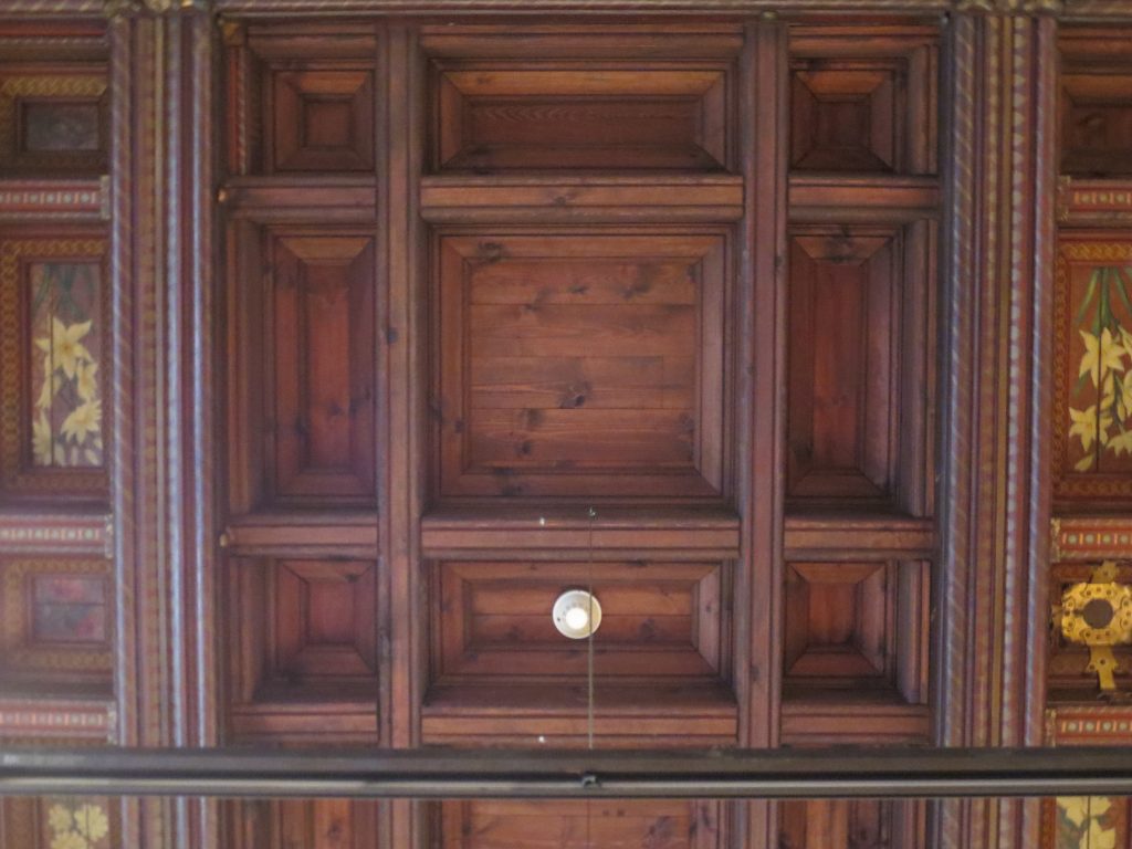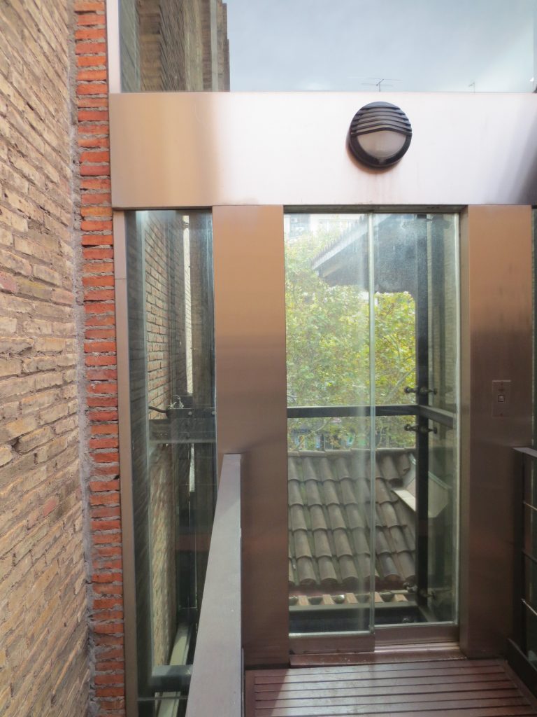 Die Holztreppe zeigt ein Spiel von Beziehungen und Transparenzen, das durch die farbigen Reflexionen, die von den hohen Glasscheiben ausgehen, noch verstärkt wird. Entlang des Weges kann der Besucher verschiedene Formen und Sgraffiti an den Wänden und auf den Holzelementen erkennen. Außerdem schmiedeeiserne Ornamente an den Geländern und Gittern.